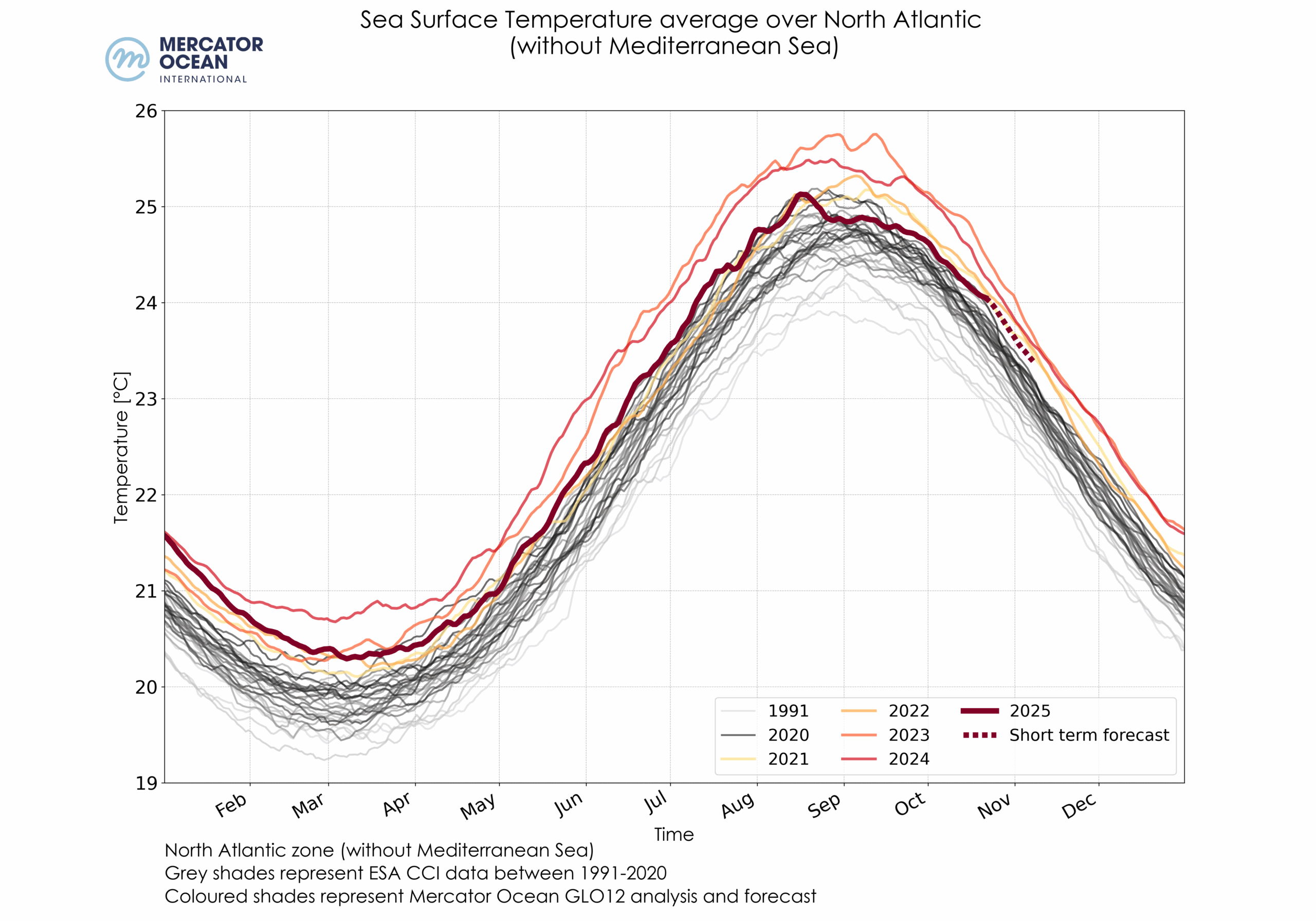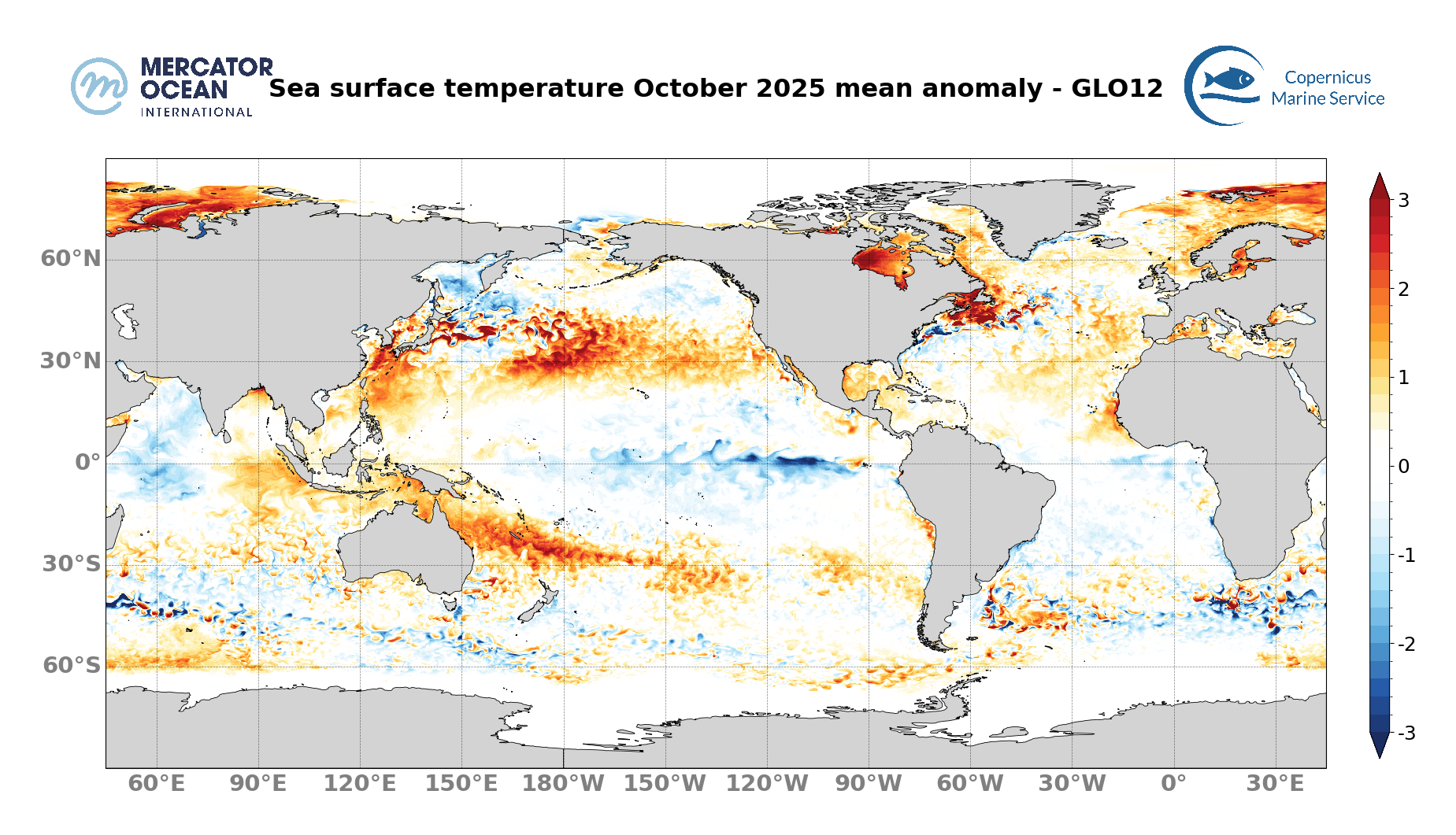 Anomalies moyennes de la TSM en octobre 2025 par rapport à une climatologie de 30 ans (1993-2022). Sources des données : température quotidienne de la surface de la mer à l’aide du système d’analyse et de prévision GLO12 de Mercator Ocean International pour 2025 ; réanalyse GLORYS12 pour calculer une moyenne climatologique.