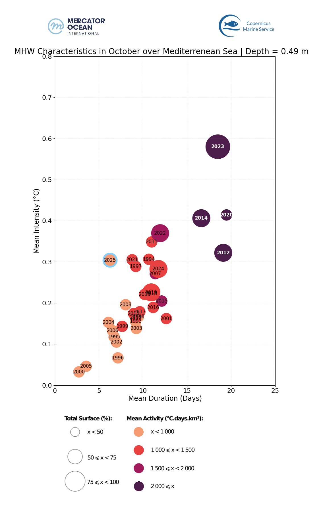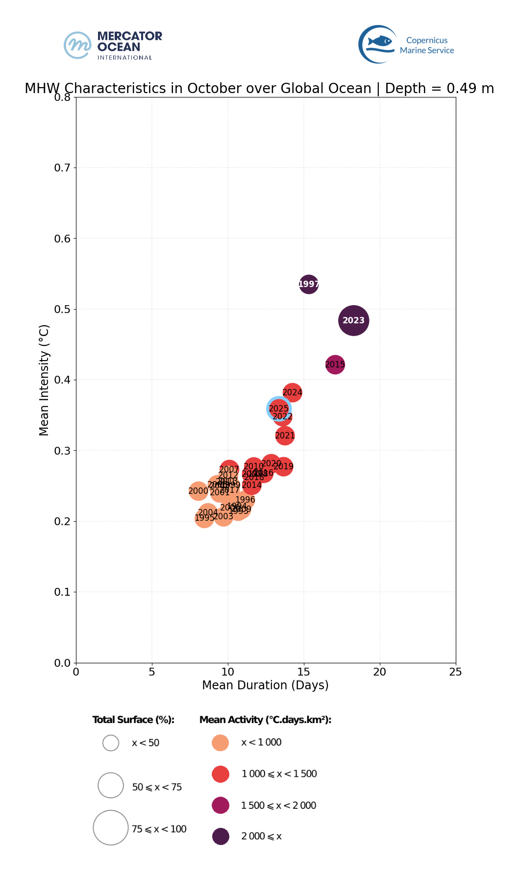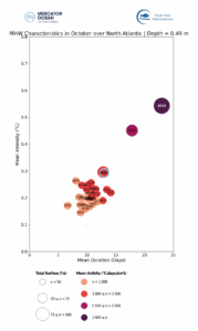 Caractéristiques des vagues de chaleur marine (durée, intensité, étendue et activité) pour les mois d’octobre entre 1993 et 2025. Le mois d’octobre 2025 est souligné par un bord bleu. Chaque bulle correspond au mois d’octobre d’une année donnée. Sa position sur l’axe horizontal – durée, sur l’axe vertical – intensité, la taille de chaque bulle indique la surface moyenne occupée, et la couleur représente l’activité de la SSM. Les caractéristiques moyennes des MHW sont calculées pour chaque mois pour l’océan global, l’Atlantique Nord et la mer Méditerranée afin d’obtenir un profil MHW pour chaque mois qui peut être comparé à ces mêmes mois des années précédentes (depuis 1993) dans un diagramme à bulles (figure ci-dessus).