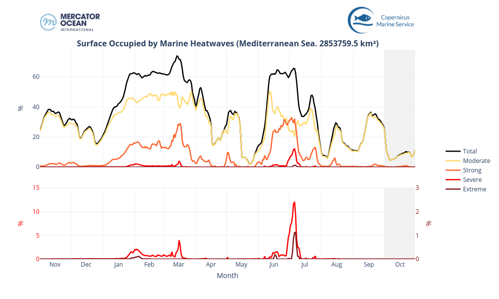 Surface occupée par les HMT dans l’océan global (entre 60°S et 60°N), les HMT en mer Méditerranée et dans l’Atlantique Nord (entre 0°N et 60°N) entre novembre 2024 et octobre 2025 sur la base d’un suivi quotidien. La ligne noire continue représente la surface totale des eaux usées domestiques, tandis que les lignes colorées représentent la surface de chaque catégorie d’eaux usées domestiques. Le fond gris met en évidence le mois d’octobre 2025.