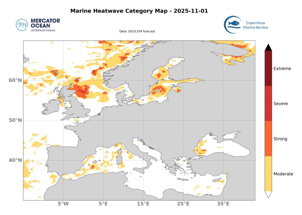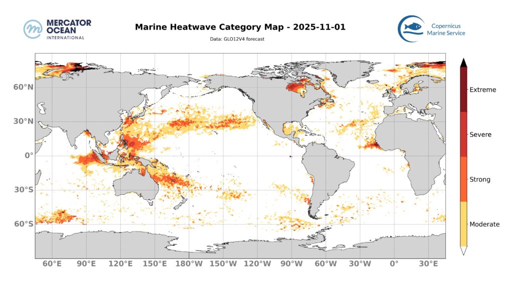 La vague de chaleur marine qui s’étend de la mer des Philippines à l’Indonésie gagne en intensité avec le développement des catégories forte et sévère, et reste stable sur le site. Une vague de chaleur marine modérée à forte s’étendant de la côte nord-est de l’Australie à 180°E est en train de se développer.