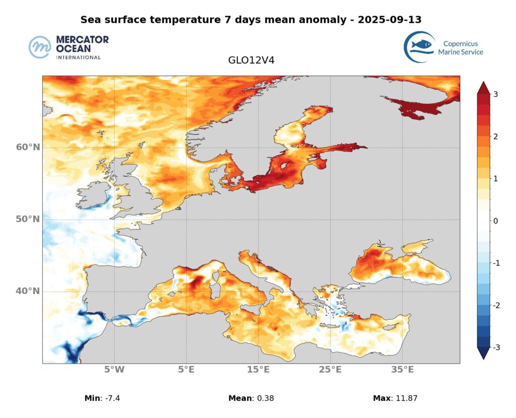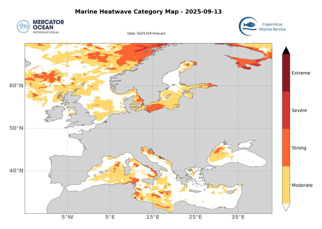 La vague de chaleur marine en mer du Nord, Norvège Norvège et la mer Baltique augmente en étendue avec des catégories modérées à fortes.
