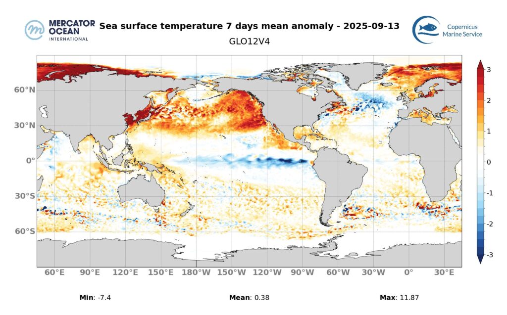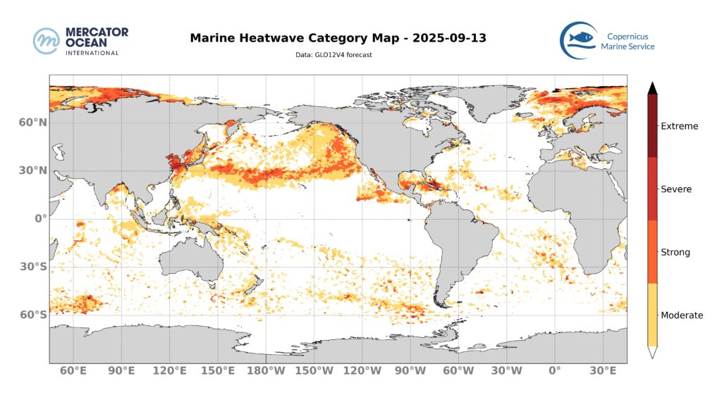 La vague de chaleur marine sur le bassin occidental augmente en intensité et en étendue, avec une catégorie modérée et localement forte. L’intensité l’intensité de la canicule marine dans le bassin oriental augmente l’intensité de la vague de chaleur marine dans le bassin oriental augmente, avec des catégories modérées et fortes.