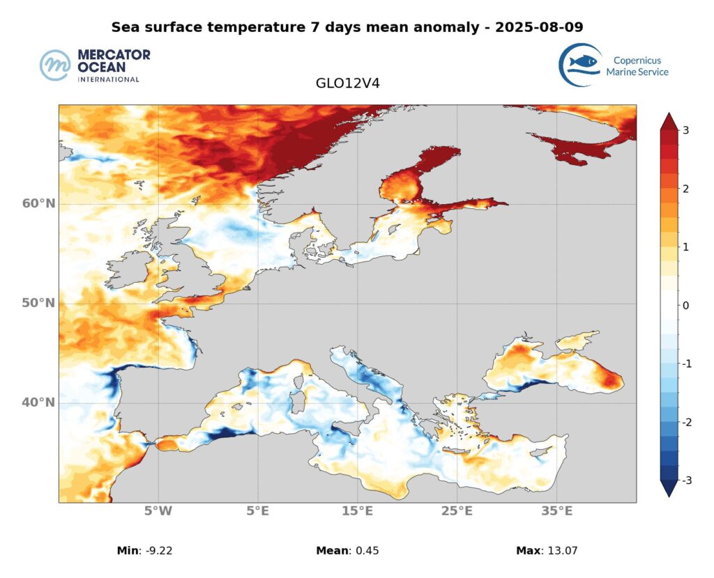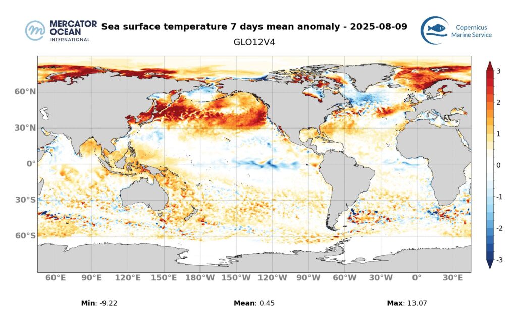 Températures moyennes de surface pour la semaine du 3 au 9 août 2025