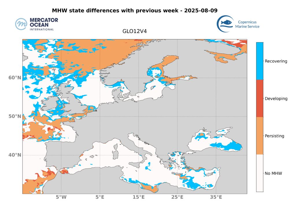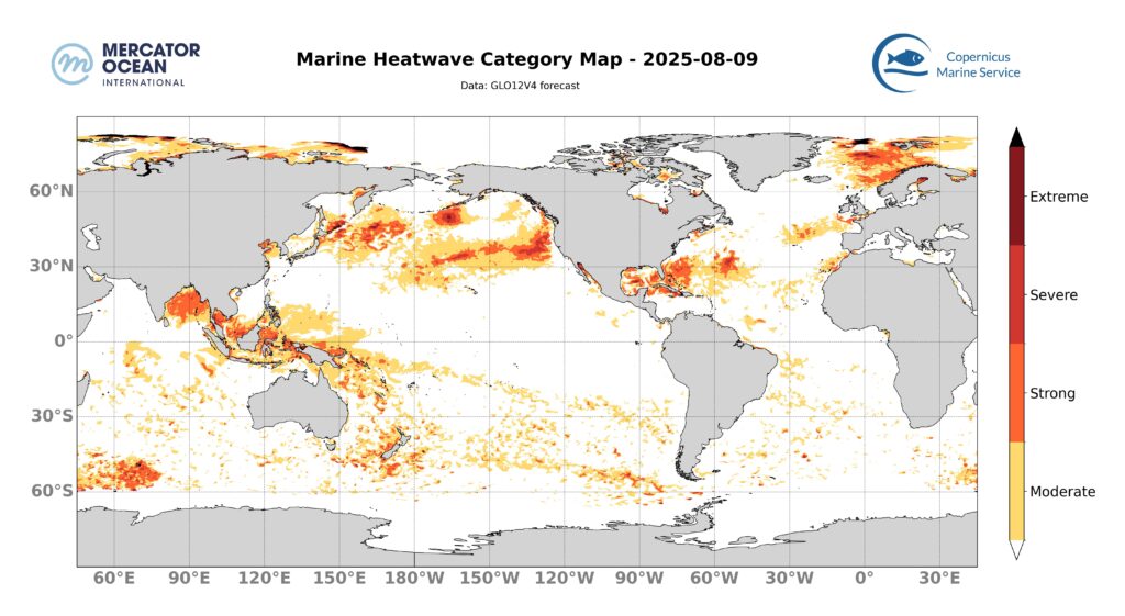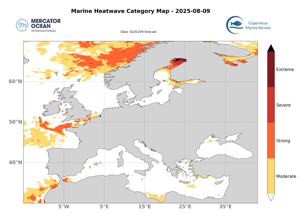 La canicule marine présente au large des côtes Bretonnes augmente en intensité avec la catégorie forte. La canicule marine en mer du Nord et de Norvège diminue en superficie avec des catégories modérées à fortes.