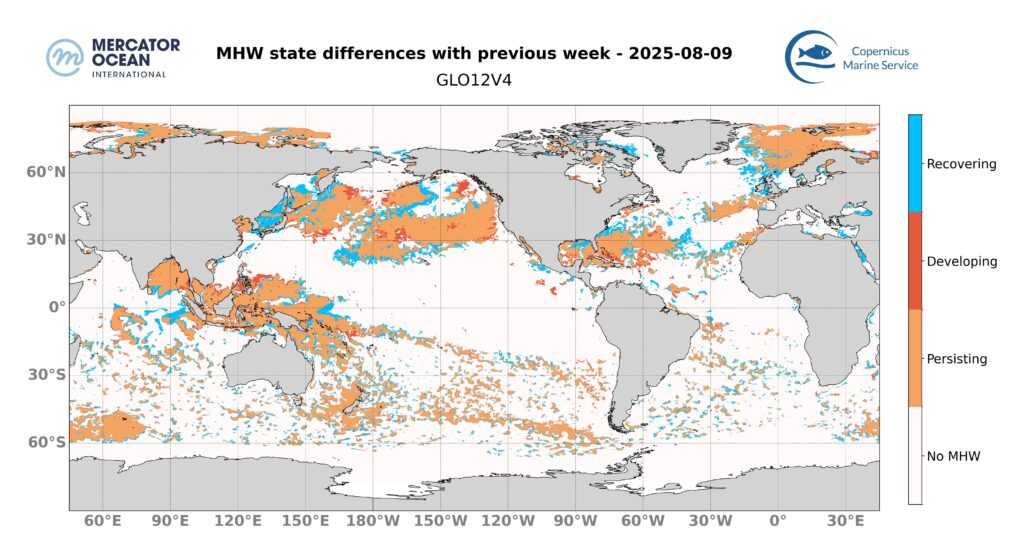 La canicule marine présente au centre du bassin vers 30°N et 60°N diminue en superficie et augmente en intensité vers les côtes canadiennes avec des catégories modérées à fortes. La canicule marine présente en Mer du Japon ainsi qu’en Mer d’Okhotsk diminue en superficie et en intensité. La canicule marine en mer d’Okhotsk a des catégories de modérées à fortes.