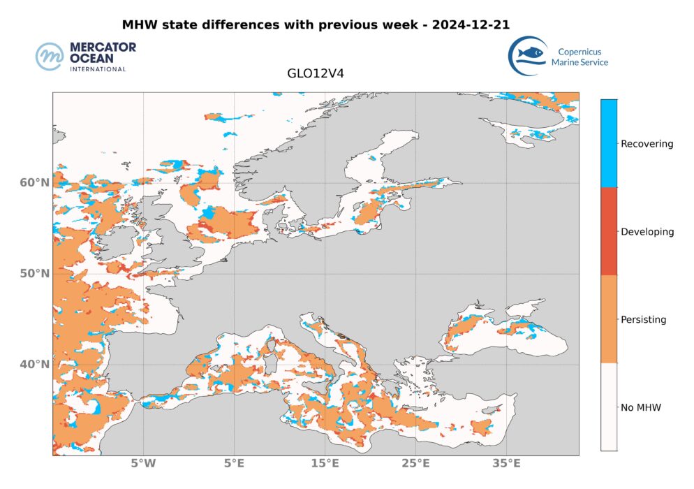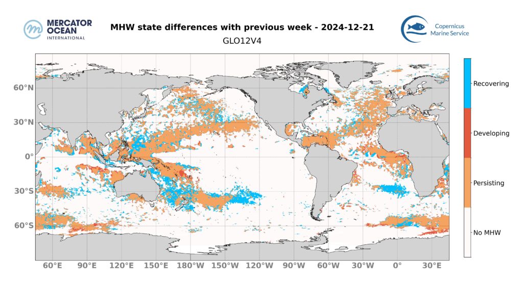 Le bulletin sur les vagues de chaleur marine fournit des prévisions et des analyses sur les vagues de chaleur marine dans le monde entier et tout au long de l’année. Les données utilisées comprennent des observations (cartes satellitaires de la température de surface de la mer) et des analyses de modèles numériques (assimilant les observations satellitaires et in situ) afin de dériver des prévisions de canicule marine pour une période de 10 jours. Les prévisions de cette semaine ont été produites en utilisant à titre de comparaison la situation de la vague de chaleur marine du 10/12/2024.