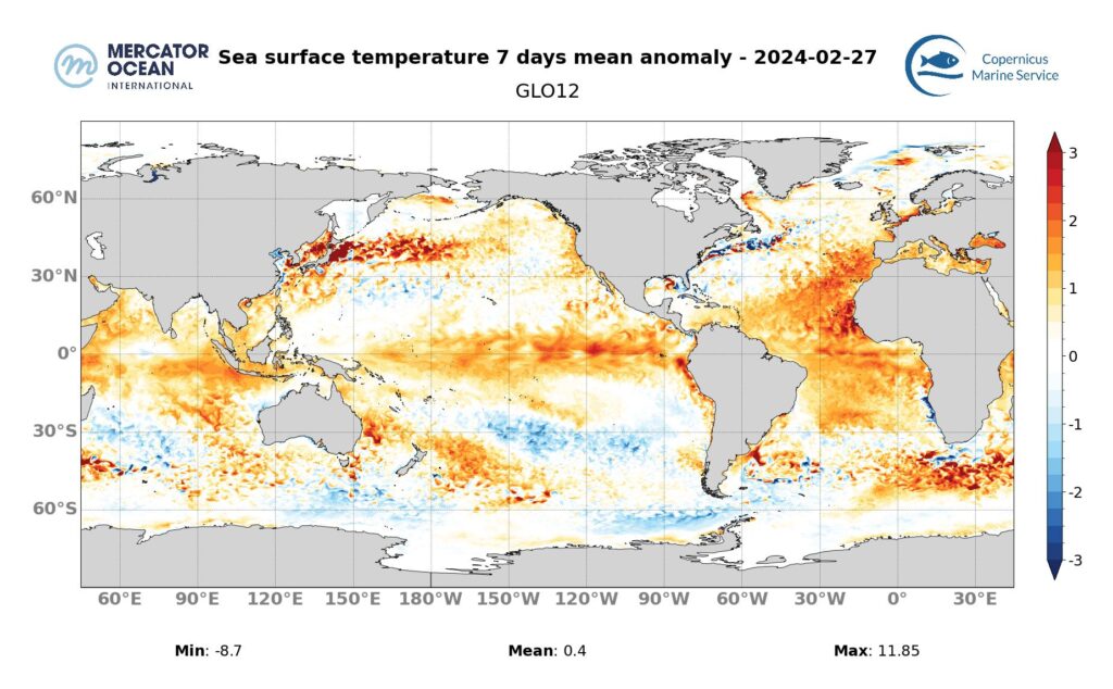 Figure 2: Carte d’anomalies hebdomadaires de température de surface pour la semaine du 13 au 20 février 2024 pour l’ensemble de l’océan mondial. Analyse GLO12. Source: Système de prévision de Mercator Océan International