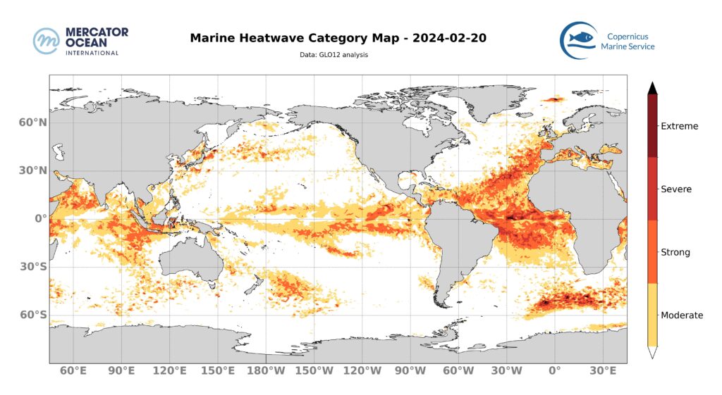Figure 1:  Carte des catégories de vagues de chaleur marine pour le 13 février 2024 pour l’ensemble de l’océan mondial. Analyse GLO12. Source: Mercator Ocean International