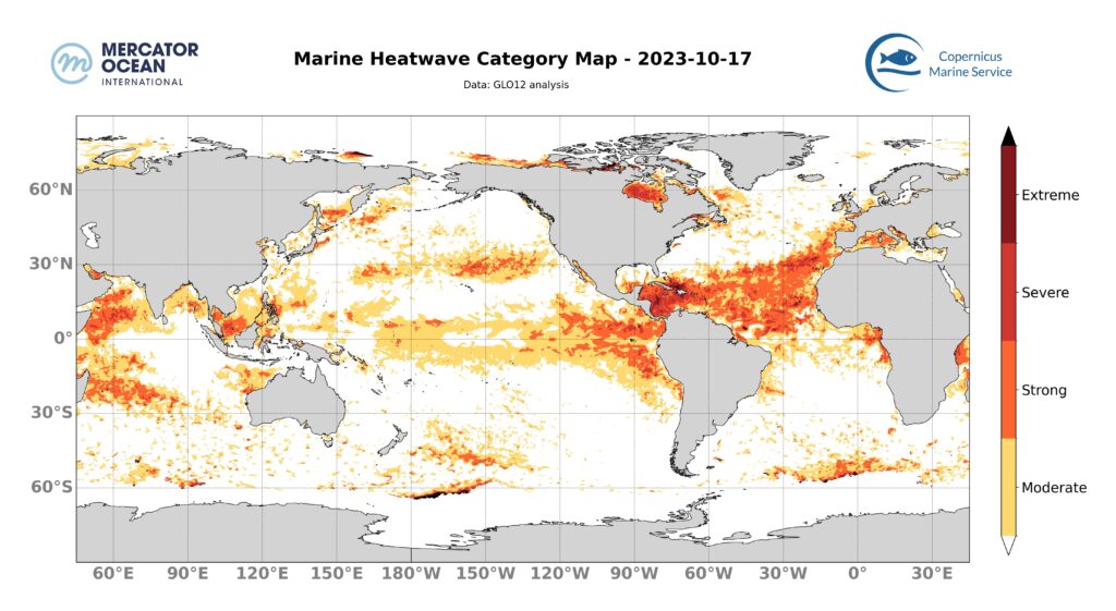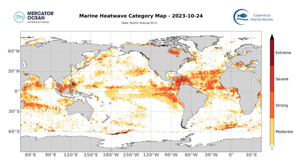 Les océanographes de Mercator Ocean International (MOi) examinent les vagues de chaleur marine à travers l’océan mondial. Ils analysent une variété d’ensembles de données allant des analyses d’observation (cartes de température de surface de la mer par satellite) aux analyses de modèles (assimilation des observations par satellite et in situ) et aux prévisions de modèles. ¹