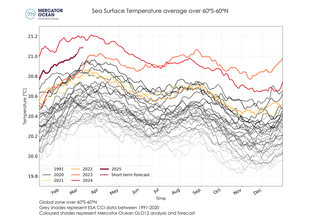 Un rapport mensuel sur les températures moyennes de surface de la mer et les conditions de canicule marine. Principaux enseignements Février 2025 a été ledeuxième mois de février le plus chaud jamais enregistré pour l’océan mondial, avec une température moyenne de 20,95 ± 0,08 °C. Le mois dernier a été le mois de février le […]