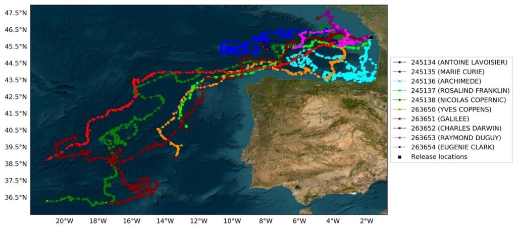 Les dix tortues relâchées en 2024 ont pris des chemins très différents. Certaines tortues, dont Nicolas Copernic, Charles Darwin et Galilée, se sont dirigées vers le sud dans l’Atlantique Nord ouvert, certaines atteignant des zones situées entre le Portugal continental et les Açores et traversant des régions fréquentées par des navires de pêche et le trafic maritime. En revanche, l’ Archimède est resté dans le golfe de Gascogne, se déplaçant principalement le long du plateau espagnol où les eaux sont légèrement plus chaudes.