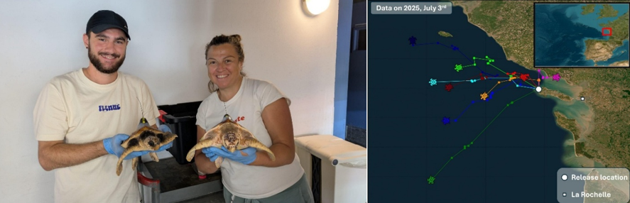 Le 30 juin 2025, le travail s’est poursuivi avec un nouveau groupe de neuf jeunes caouannes réhabilitées et relâchées à La Rochelle. Chaque tortue est équipée d’une balise microsatellite. Les données collectées permettront d’améliorer la capacité à identifier les schémas de migration saisonnière, les habitats préférés et l’exposition potentielle aux risques liés à l’activité humaine.