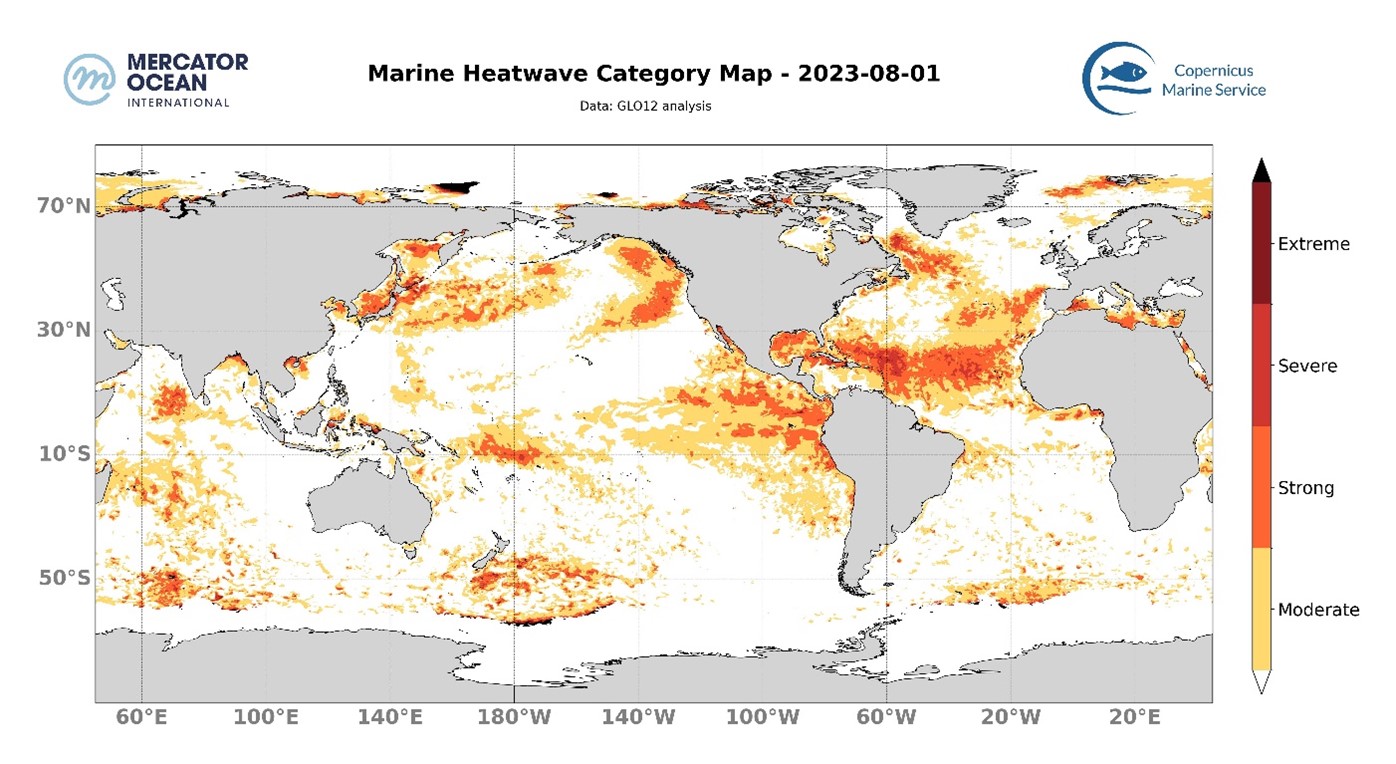 Figure 1: Map of marine heat wave categories for the 1st of August 2023 for the entire world ocean. GLO12 analysis. Source: Mercator Ocean International