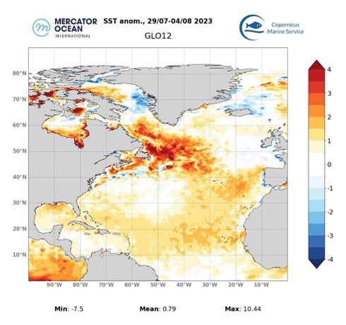 Figure 4: GLO12 surface temperature anomaly (Mercator Ocean) averaged over the 7 days preceding 4 August 2023, over the North Atlantic. Source : Mercator Ocean International.