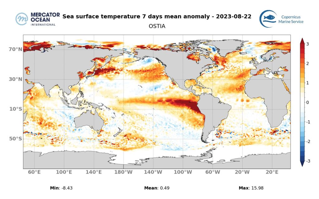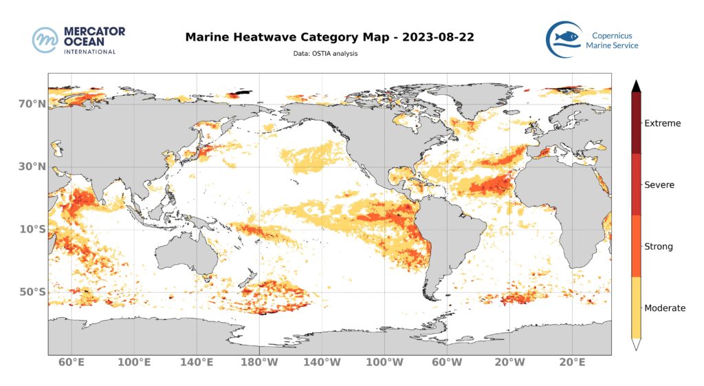 Mercator Ocean International oceanographers examine marine heatwaves across the global ocean for this month of August. They analyse a variety of datasets from observation analyses (satellite sea surface temperature maps) to model analyses (assimilating satellite and in situ observations) and model forecasts.¹