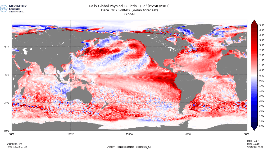 Figure 2: Sea Surface temperature anomaly taken on 24 July, showing a 9-day forecast up to 02 August, 2023. There are heightened temperatures across the global ocean (red zones) as compared to the long-term average.  Source: Mercator Ocean International, http://bulletin.mercator-ocean.fr/fr/PSY4#3/75.50/-50.98