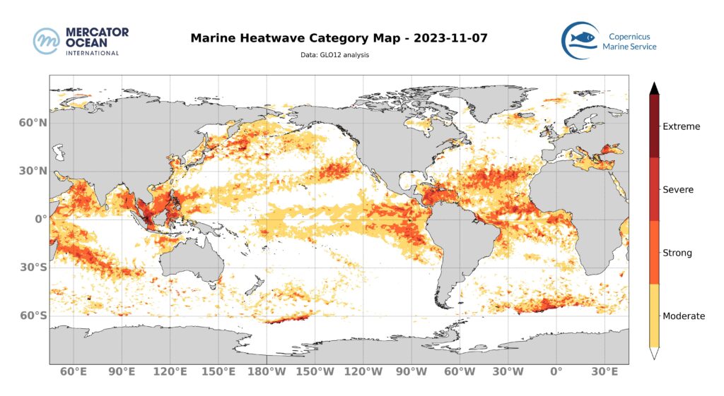 Mercator Ocean International (MOi) oceanographers examine marine heatwaves across the global ocean. They analyse a variety of datasets from observation analyses (satellite sea surface temperature maps) to model analyses (assimilating satellite and in situ observations) and model forecasts.¹