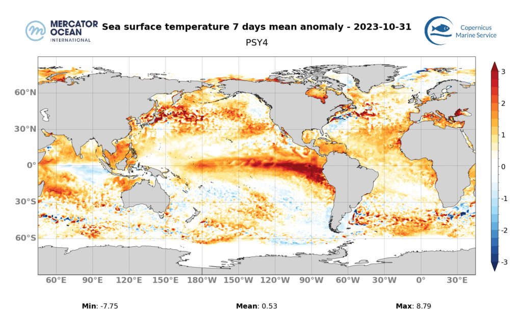 - In the Tropical Pacific, the marine heatwave linked to the formation of El Niño remains stable, with moderate to strong levels of intensity overall. The weekly temperature anomaly in the eastern part of the basin is in the region of 1.5°C to 3°C.