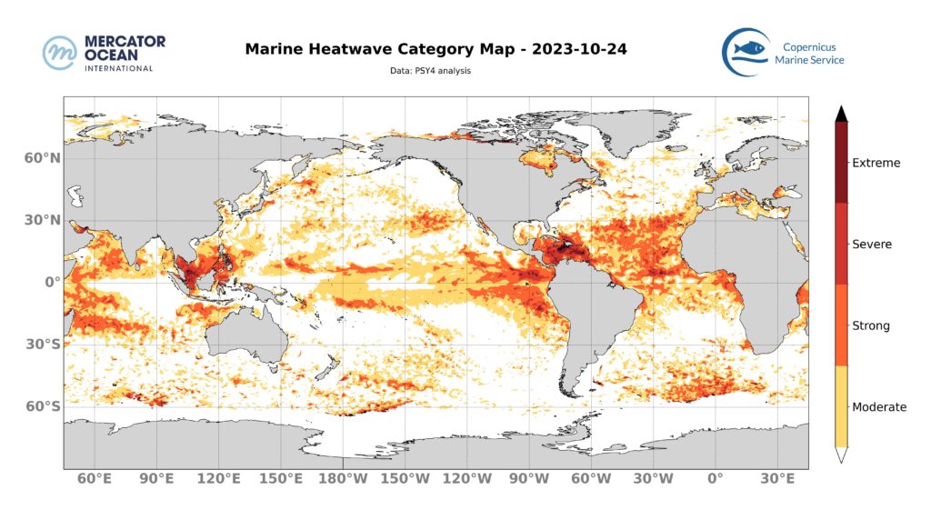 Mercator Ocean International (MOi) oceanographers examine marine heatwaves across the global ocean. They analyse a variety of datasets from observation analyses (satellite sea surface temperature maps) to model analyses (assimilating satellite and in situ observations) and model forecasts.¹