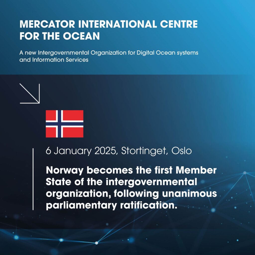 Norway has officially become the first Member State of the Mercator International Centre for the Ocean, following the unanimous ratification of the Convention by the Norwegian Parliament. This development represents a significant milestone in the ongoing establishment of the intergovernmental organization dedicated to the development of Digital Ocean systems and services.