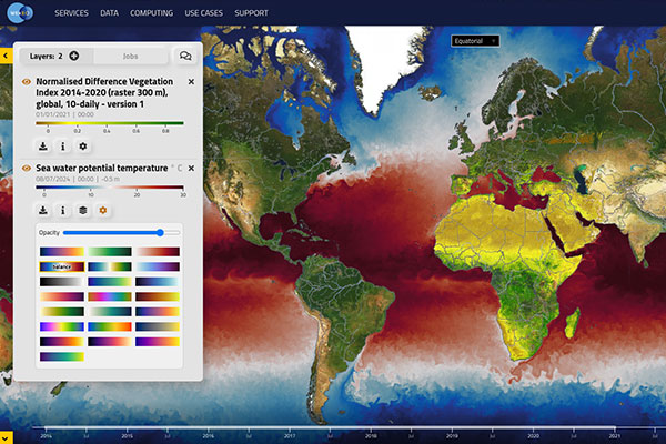 WEkEO, implemented by EUMETSAT, ECMWF, EEA and Mercator Ocean, provides the WEkEO Earth viewer, showing Earth Observation data across the Copernicus Programme services and Sentinel portfolios, available upon registration.