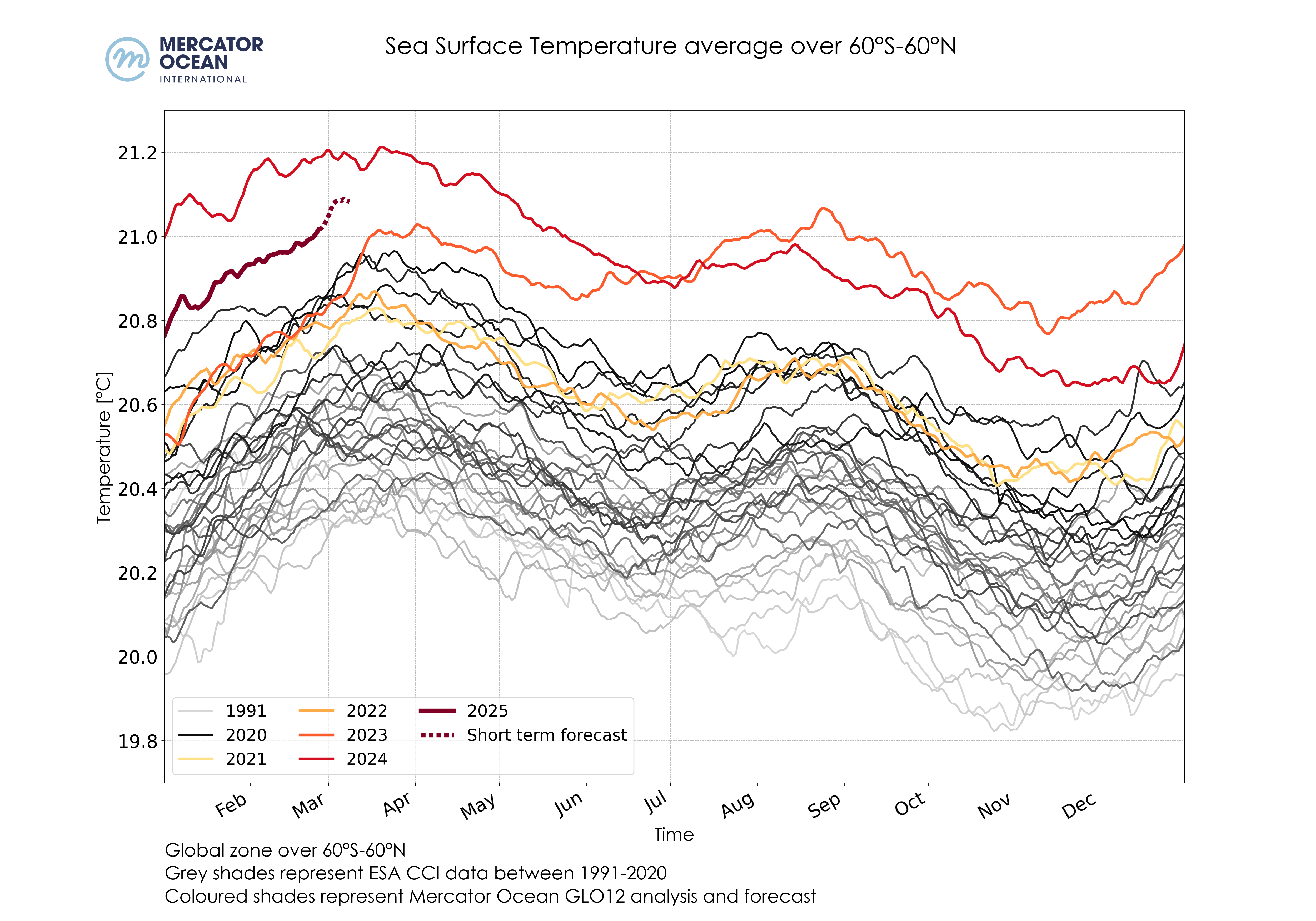 • February 2025 was the 2nd warmest February on record (after 2024), with a mean sea surface temperature (SST) of 20.95 ± 0.08 °C (against 21.11 ± 0.04 °C for 2024) at the global level (between 60°S and 60°N).