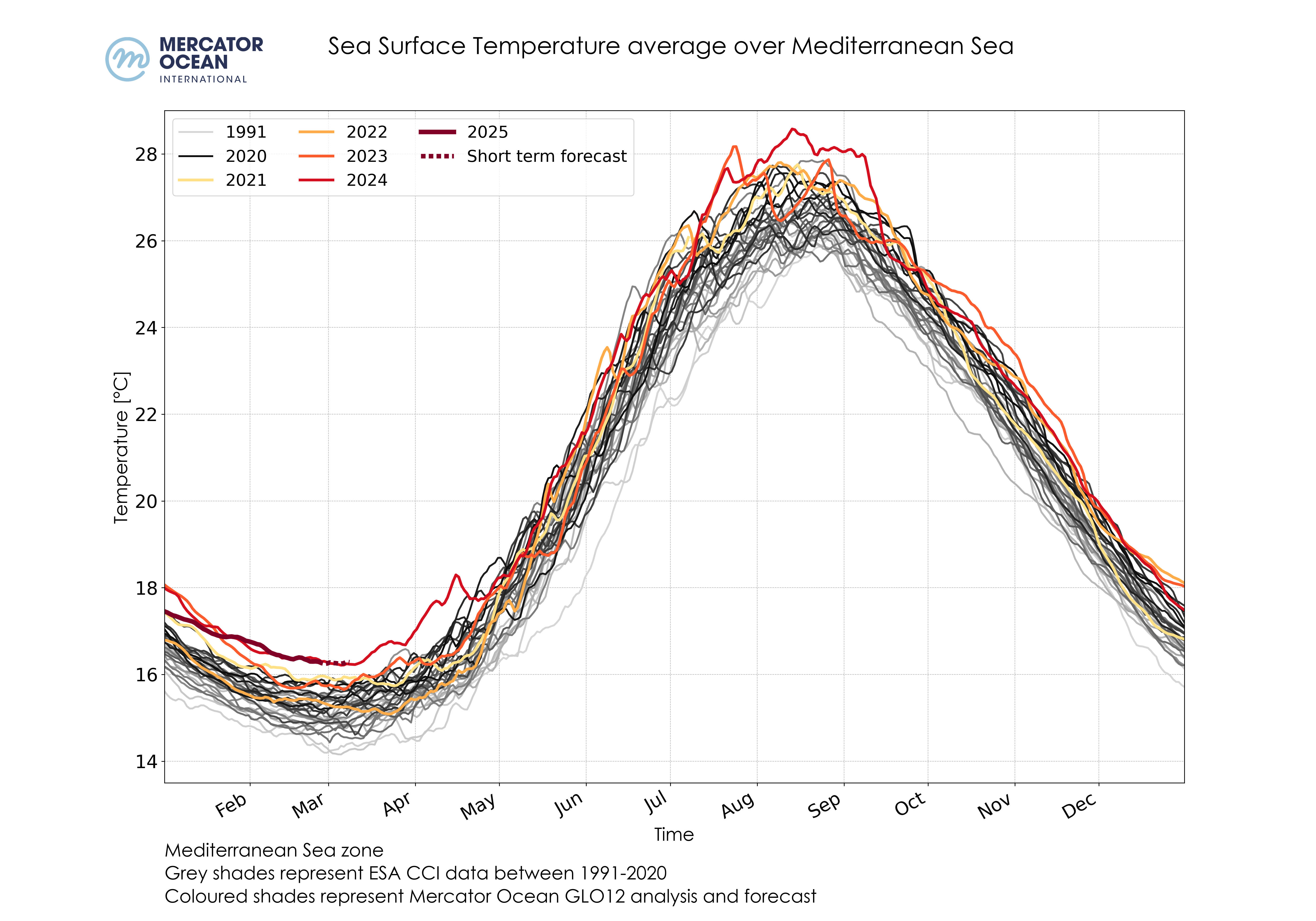 Figure 1:  Daily sea surface temperatures (SST) averaged for the global ocean (top), the Mediterranean Sea (left) and the North Atlantic Ocean (right) between 1991-2020 using ESA’s Climate Change Initiative (grey shades), and between 2021-2025 (colored shades) using Mercator Ocean International’s GLO12 analysis and forecast.
