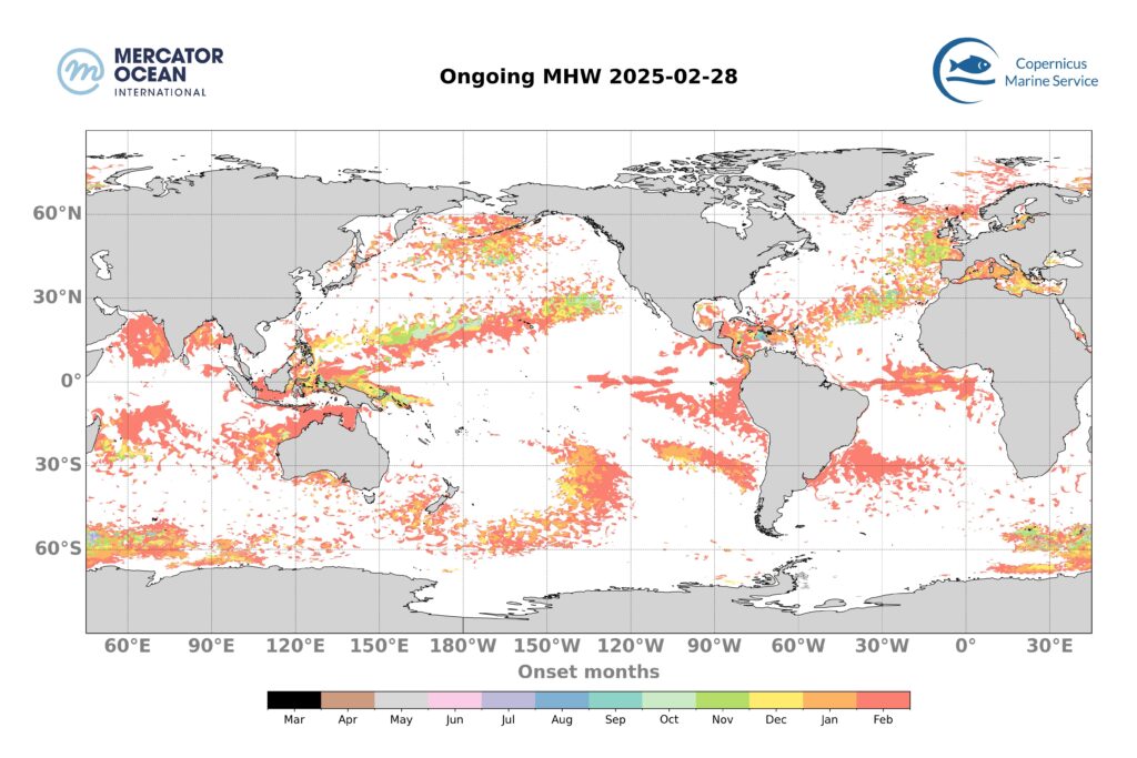 • In the European Zone, February 2025 experienced the largest marine heatwave geographical extent of the past year.