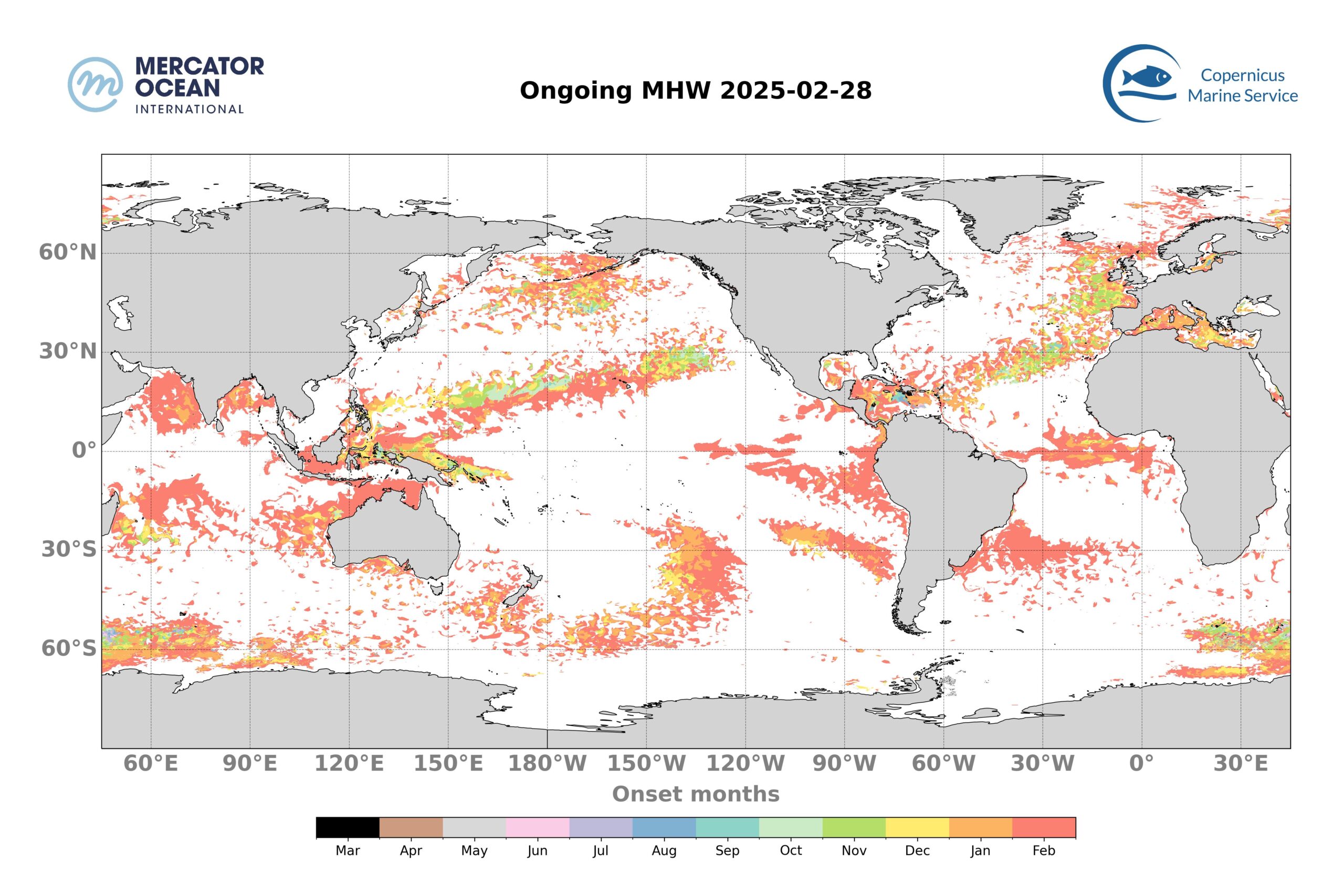 Long warming events may induce important stress on marine ecosystems. In this section are shown the ongoing marine heatwave (MHW) events on February 28, and when those have initiated.