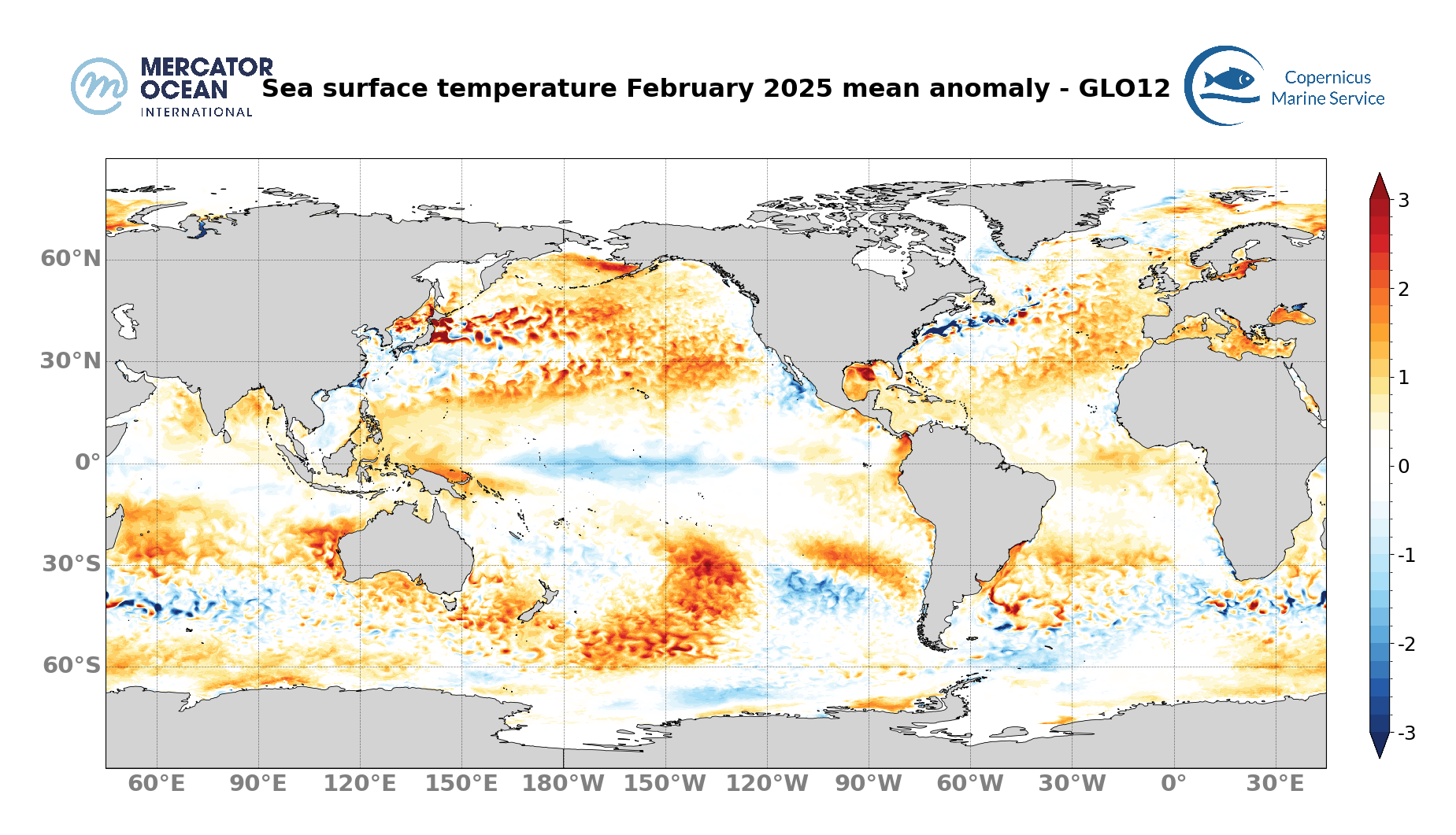 Figure 2: February 2025 Mean SST Anomaly relative to a 30-year climatology (1993-2022), calculated using daily data from Mercator Ocean International’s GLO12 analysis and forecasting system for 2025 and from the GLORYS12 reanalysis for the climatological mean.