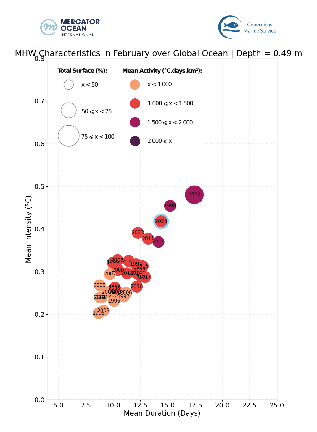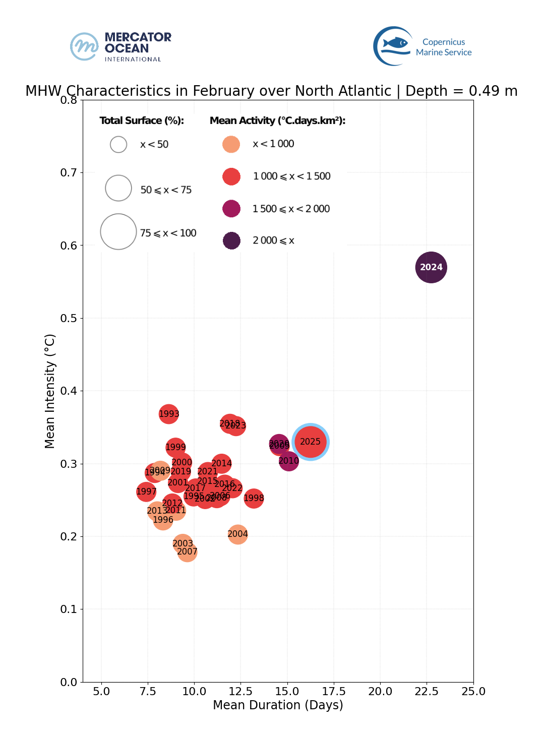 • In the North Atlantic, February 2025 was the 2nd most extreme February month in terms of surface and duration, lower than February 2024 that showed record mean intensity, duration and total activity.
