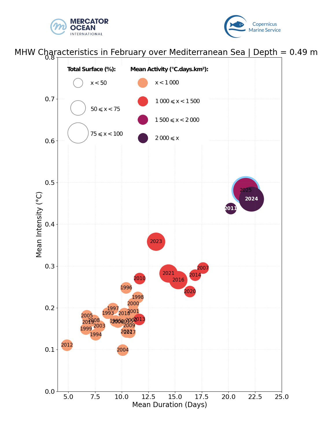 The MHW statistics (duration, intensity, surface occupied and activity) for February 2025 are compared to those for February months from previous years (since 1993).