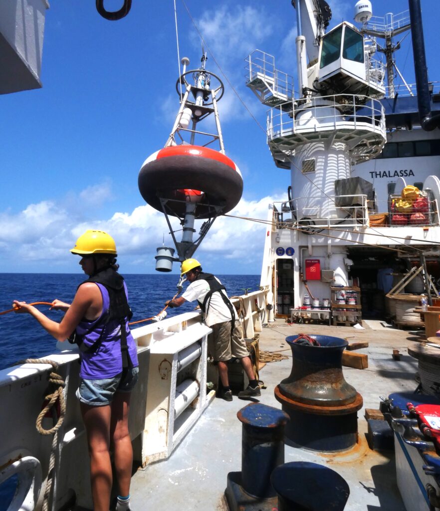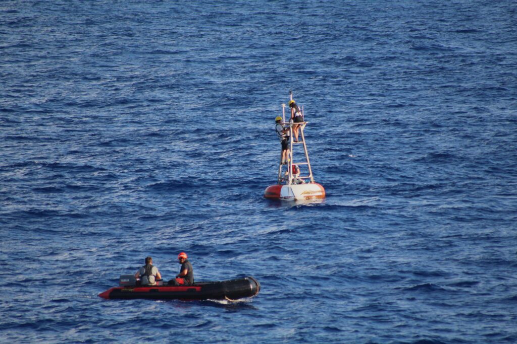 Ergane Fouchet is directly involved in buoy maintenance, approaching each buoy by zodiac, boarding the structures to recover instruments, downloading a full year of data and redeploying newly equipped systems, while also collecting temperature profiles and seawater samples for laboratory analysis.