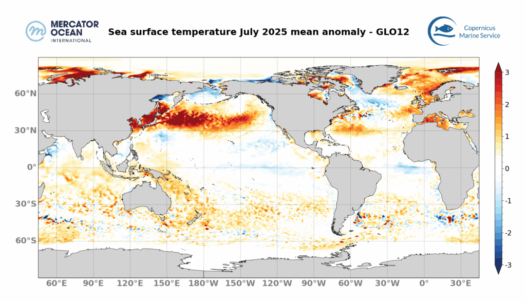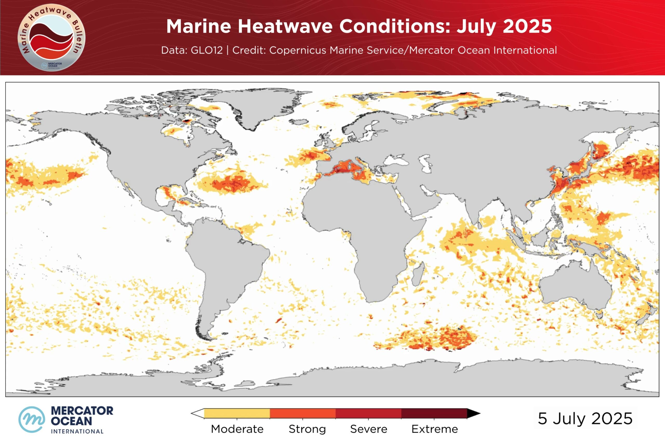 The Western North Pacific (Sea of Okhotsk) or at the boundary of the North Atlantic and the Arctic Ocean (Norwegian sea) saw very intense MHW events in July 2025, with implications for marine life and atmospheric interactions.